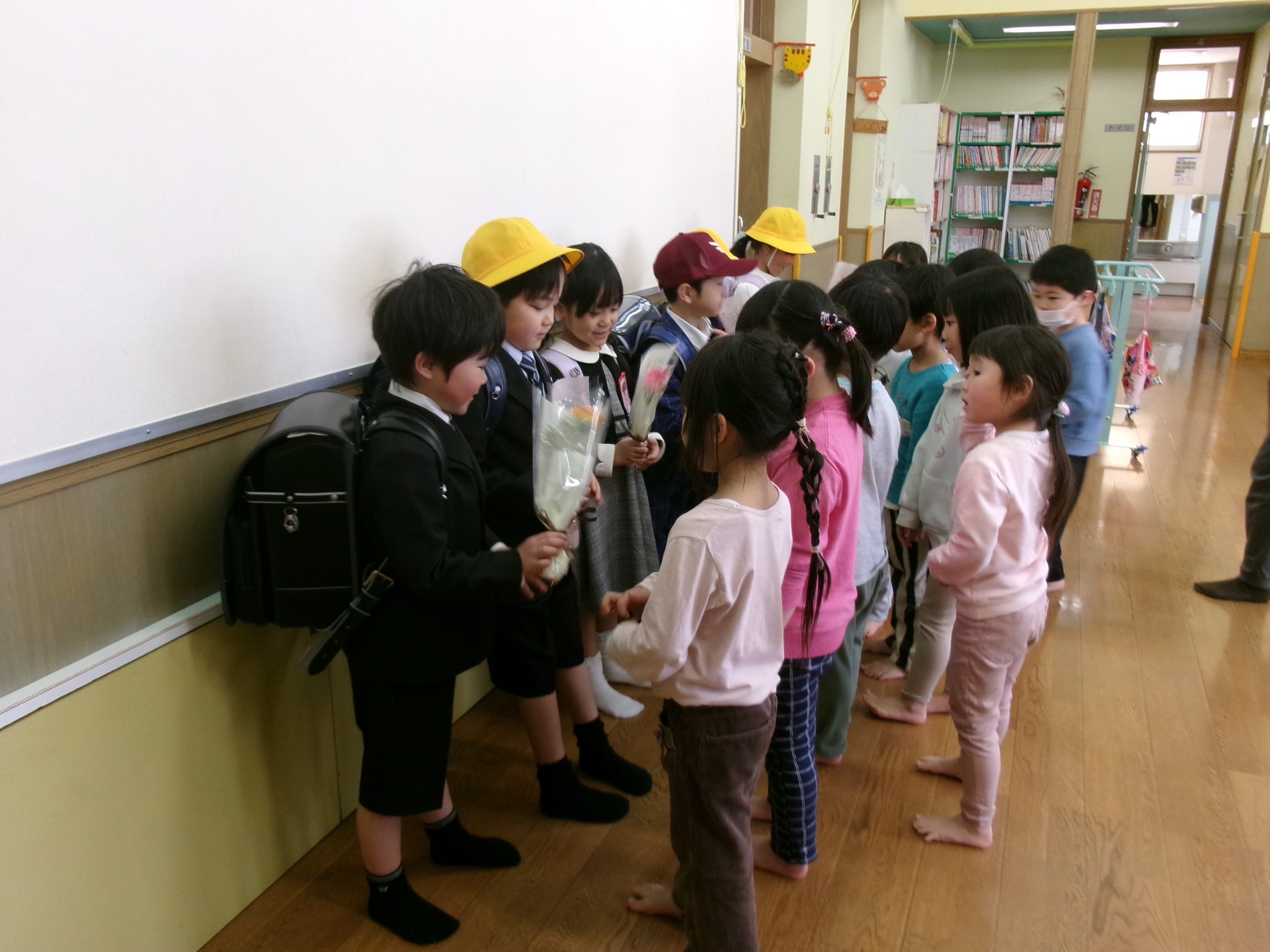 今日は北松園小学校に入学した新一年生が素敵な姿を見せに来てくれました。すっかりお兄さん、お姉さんの顔になって頼もしい先輩たちでした。風の子の子どもたちは、久しぶりの再会に大喜びでした。ご入学おめでとうございます!