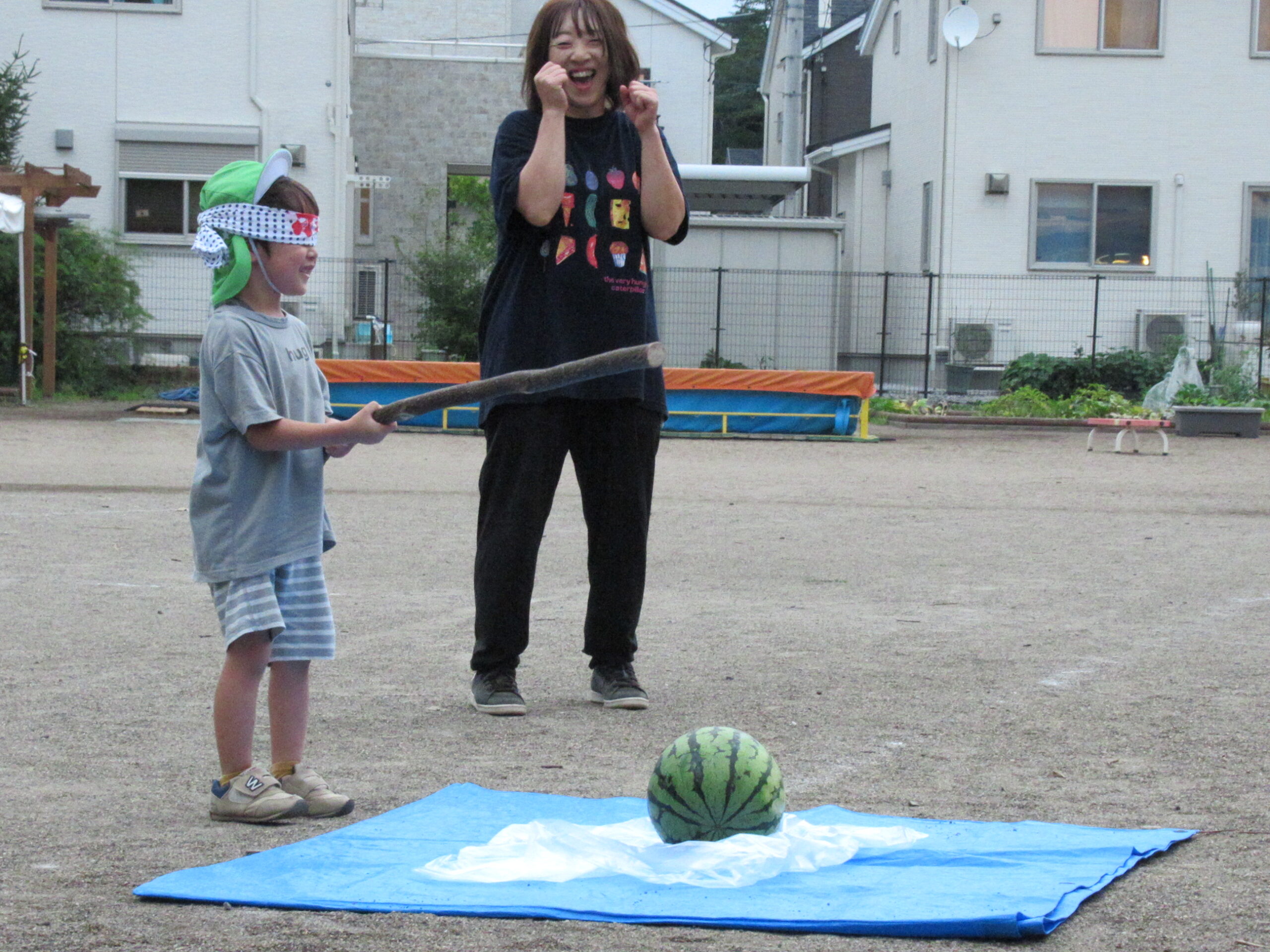 1人ずつ目隠しをして、スイカを割るのですがこれがなかなか難しい!