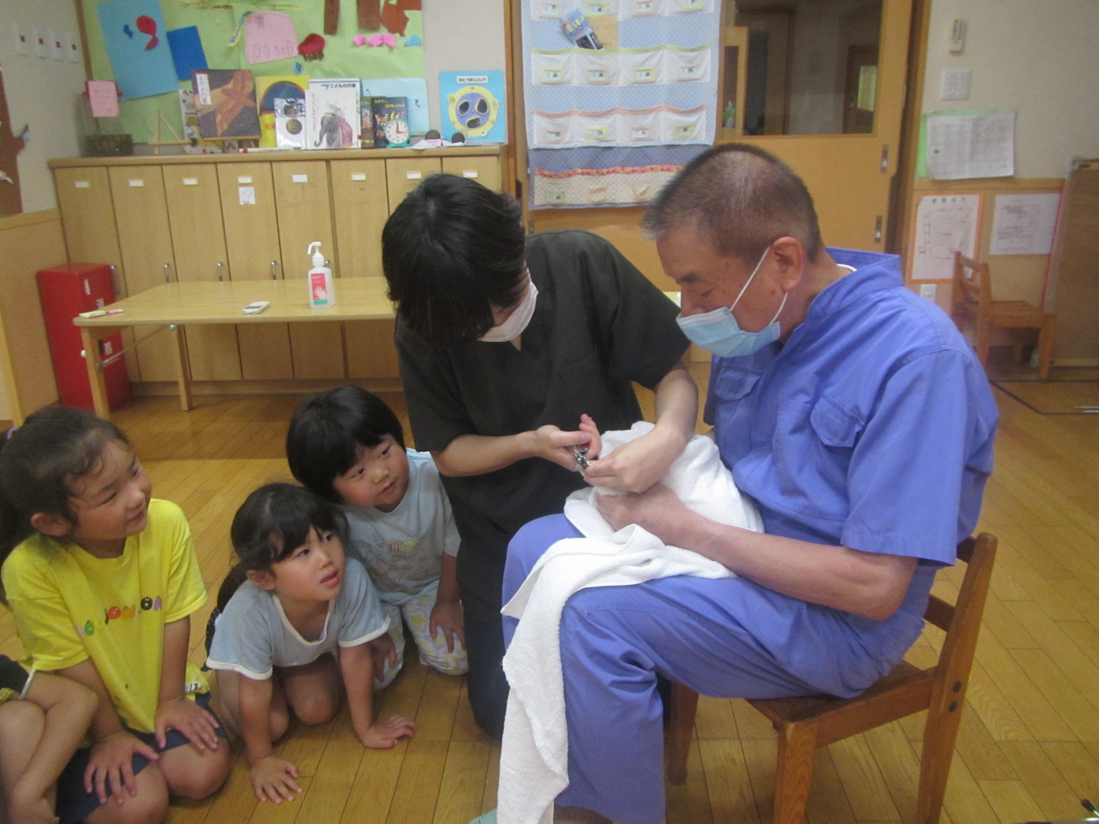 動物病院の先生が保育園に来てくれ、うさぎのははいくんの健診をしてくれました。
