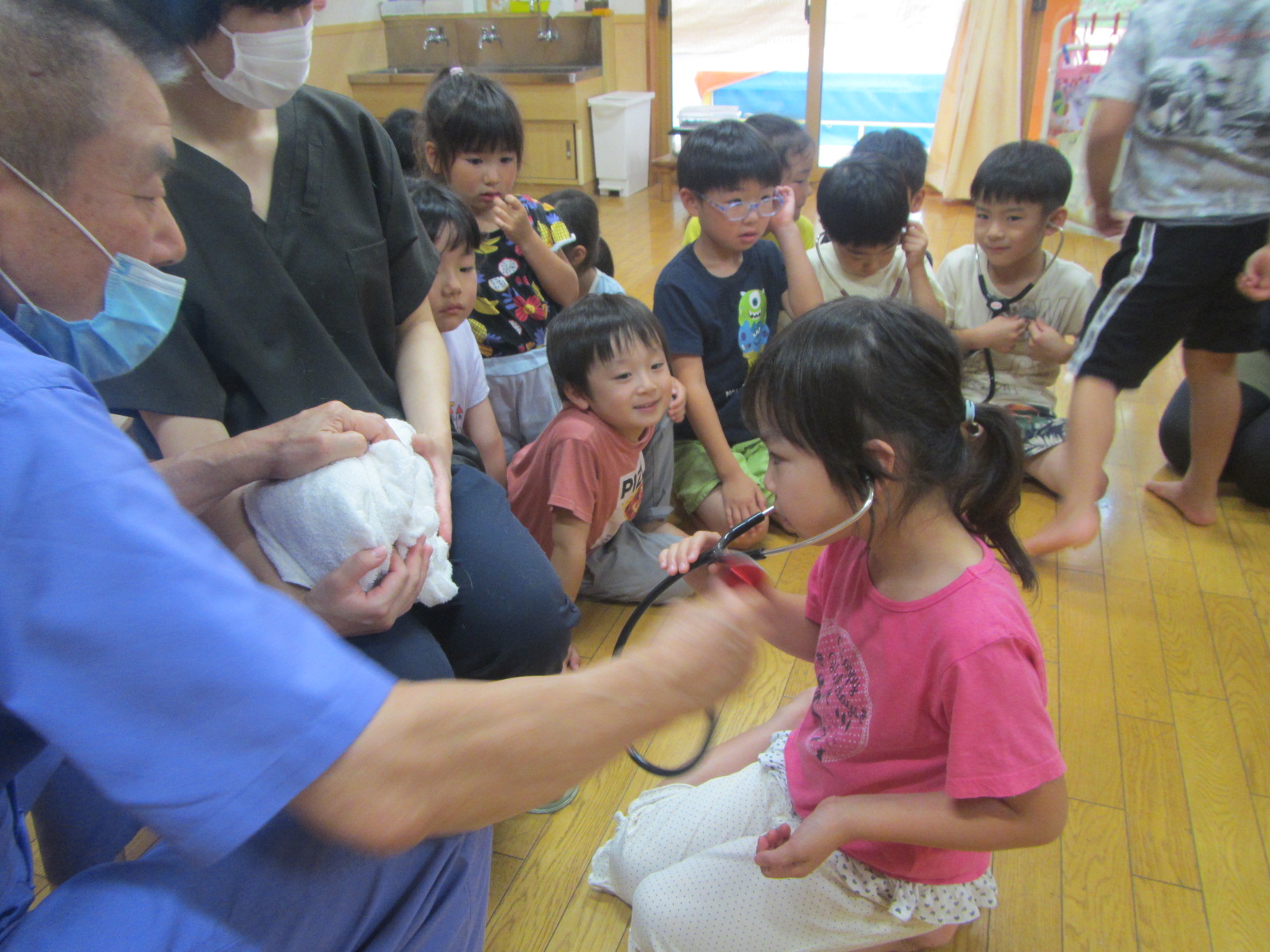”うさぎさんとともだちになるにはどうしたらいいかな?”と、うさぎについて色々教えてもらったり、聴診器を使って自分たちの心臓の音とはいくんの心臓の音を聞かせてもらったりしました。