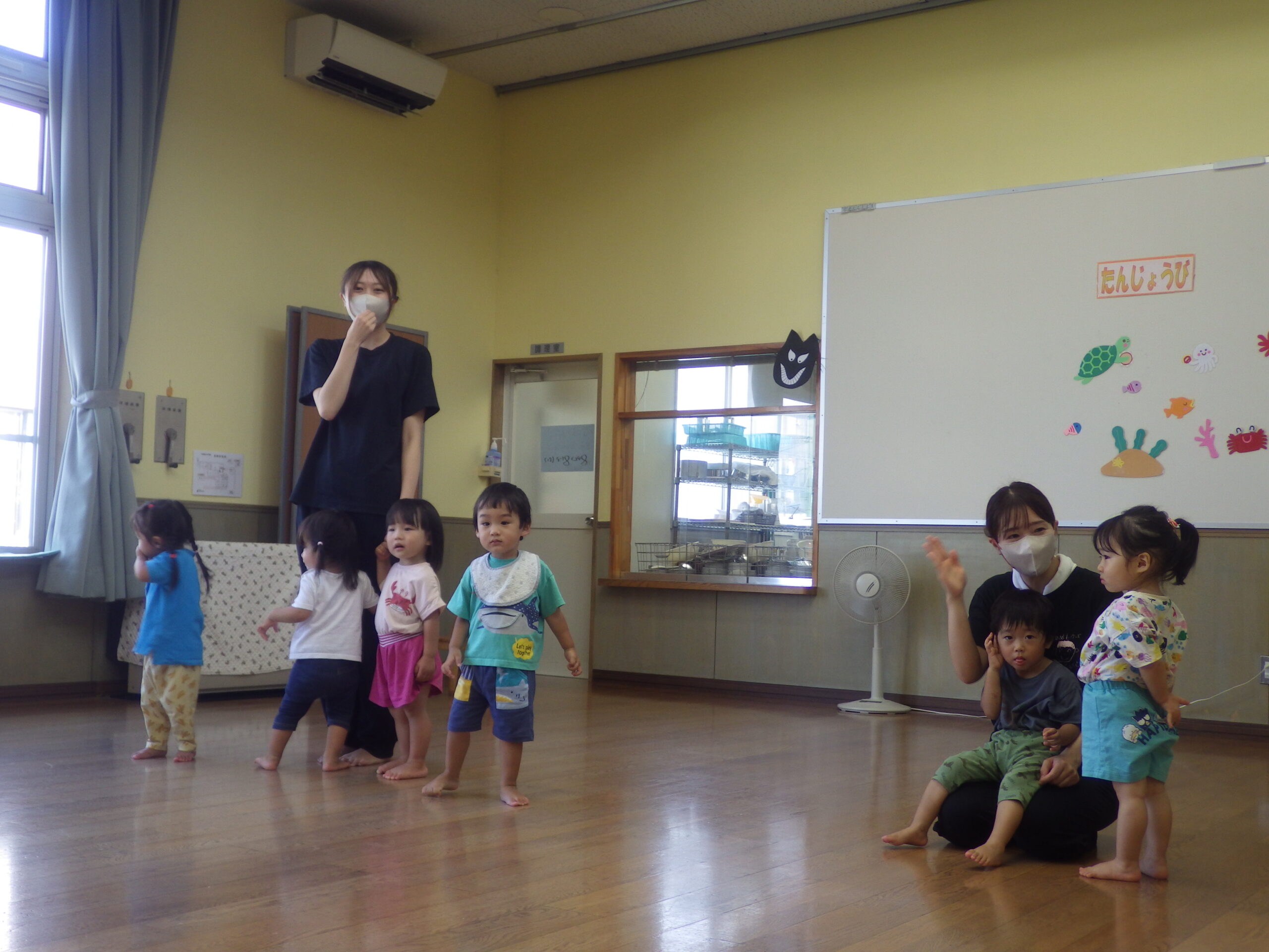 今日は、8月生まれの誕生会でした。風の子保育園は1名のお友だちがひとつ大きくなり、みんなでお祝いしました。クラスの出し物は、すぎのこぐみ…「手遊び:野菜のうた」 そらぐみ…「歌:すいかの名産地」 ひかりぐみ…「歌:チポリーノの冒険」 つばさぐみ…「夏祭りごっこの商品の紹介」 たいようぐみ…「キャンプの絵の発表」でした。職員の劇は「まゆとカッパ」。たくさんのカッパたちや、おすもうに大喜びでした。誕生会後は、さっそくおすもうごっこで盛り上がりました!!誰がおすもうチャンピオンになるのか…楽しみです♪