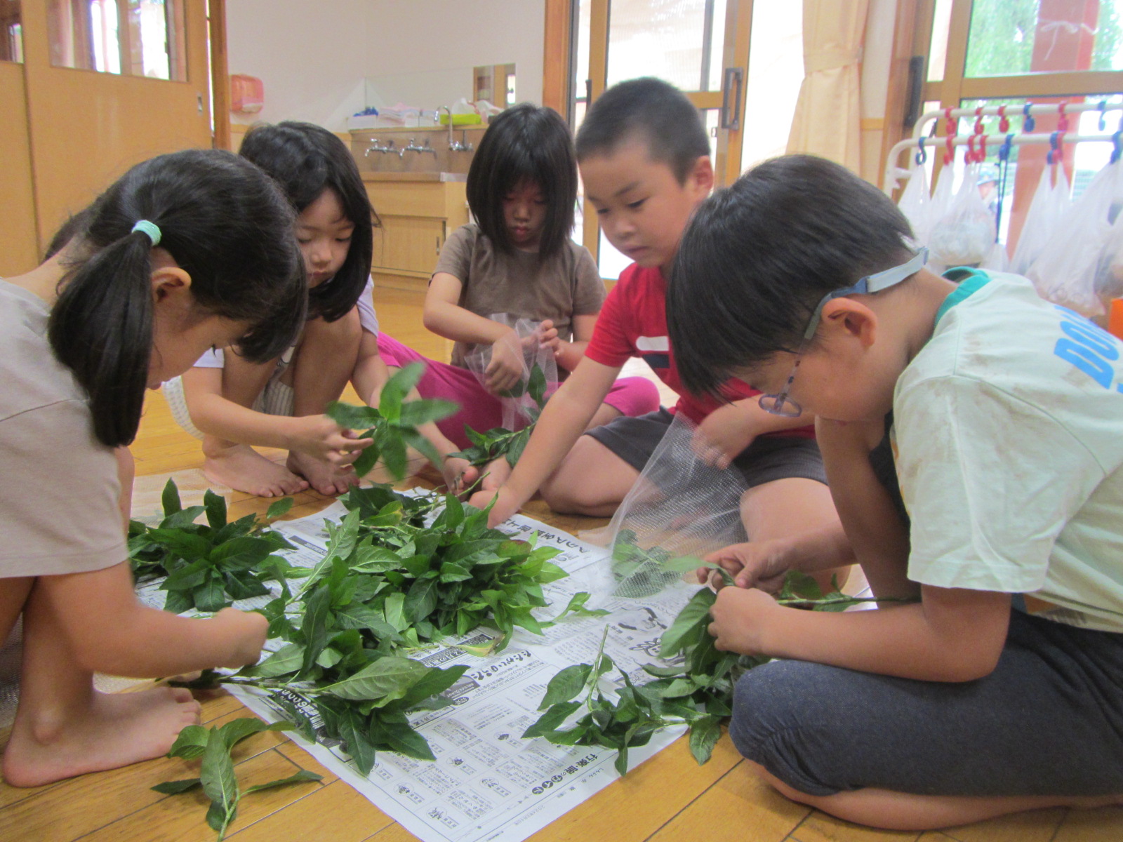 まずは長い布を走って破くことからはじめ、次は藍の葉っぱをネットと袋を使って細かくしていきます。