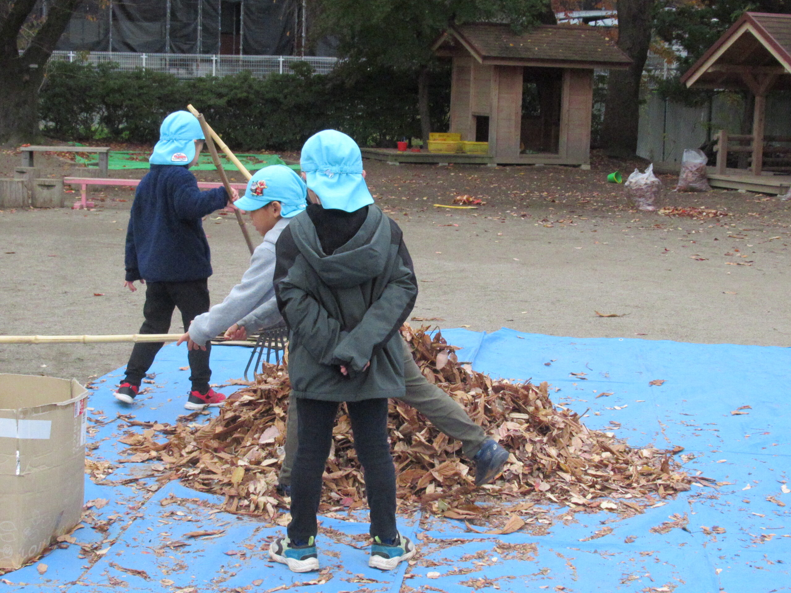 朝からこども達みんなで落ち葉をあつめて、やきいも会の準備です。