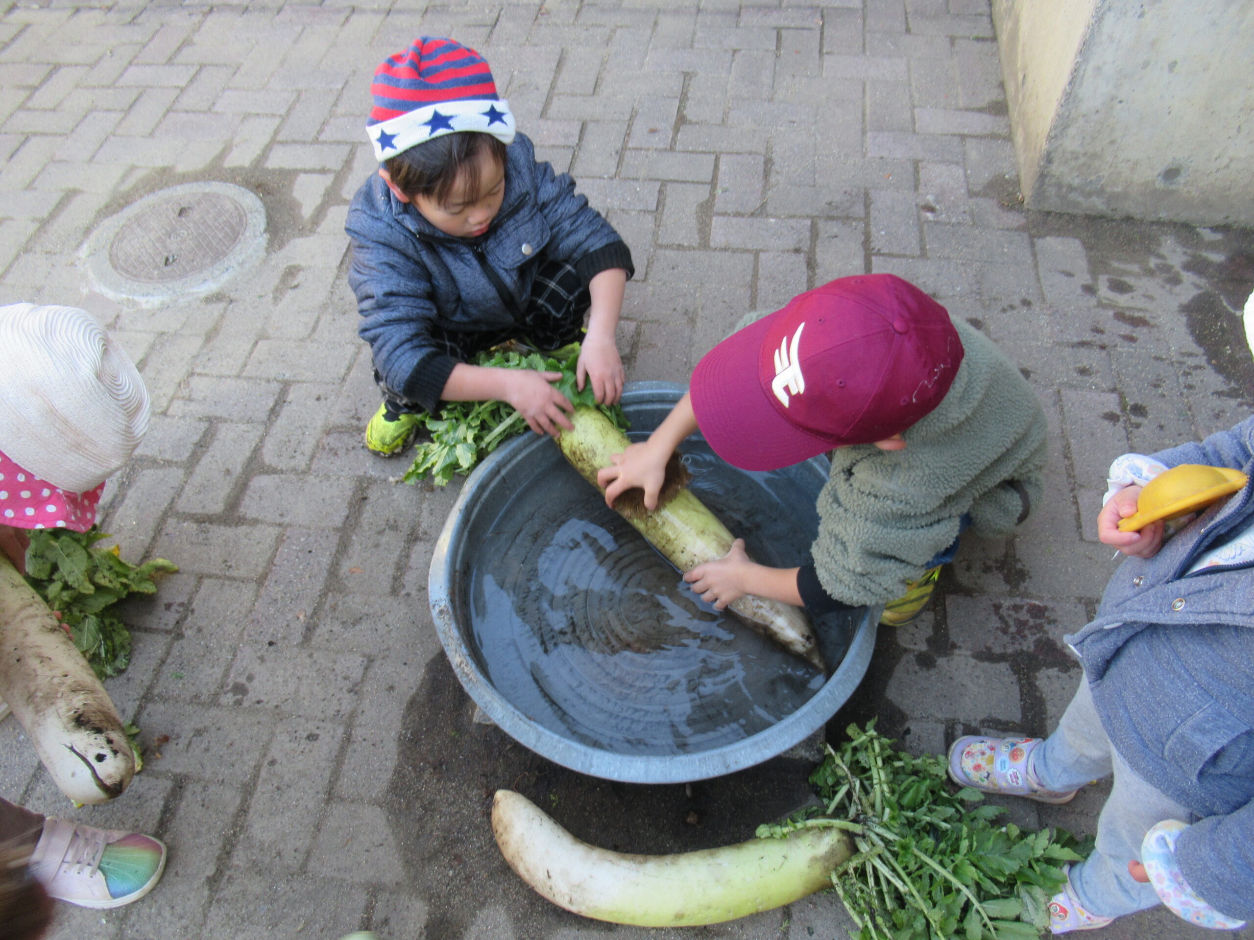土の中に保存していた大根は冷えて冷たくなっていて(特に今日は霜も降りていたので)洗うのも大変そうでしたが、さすがたいようさん。仲間と協力して大根を洗い
