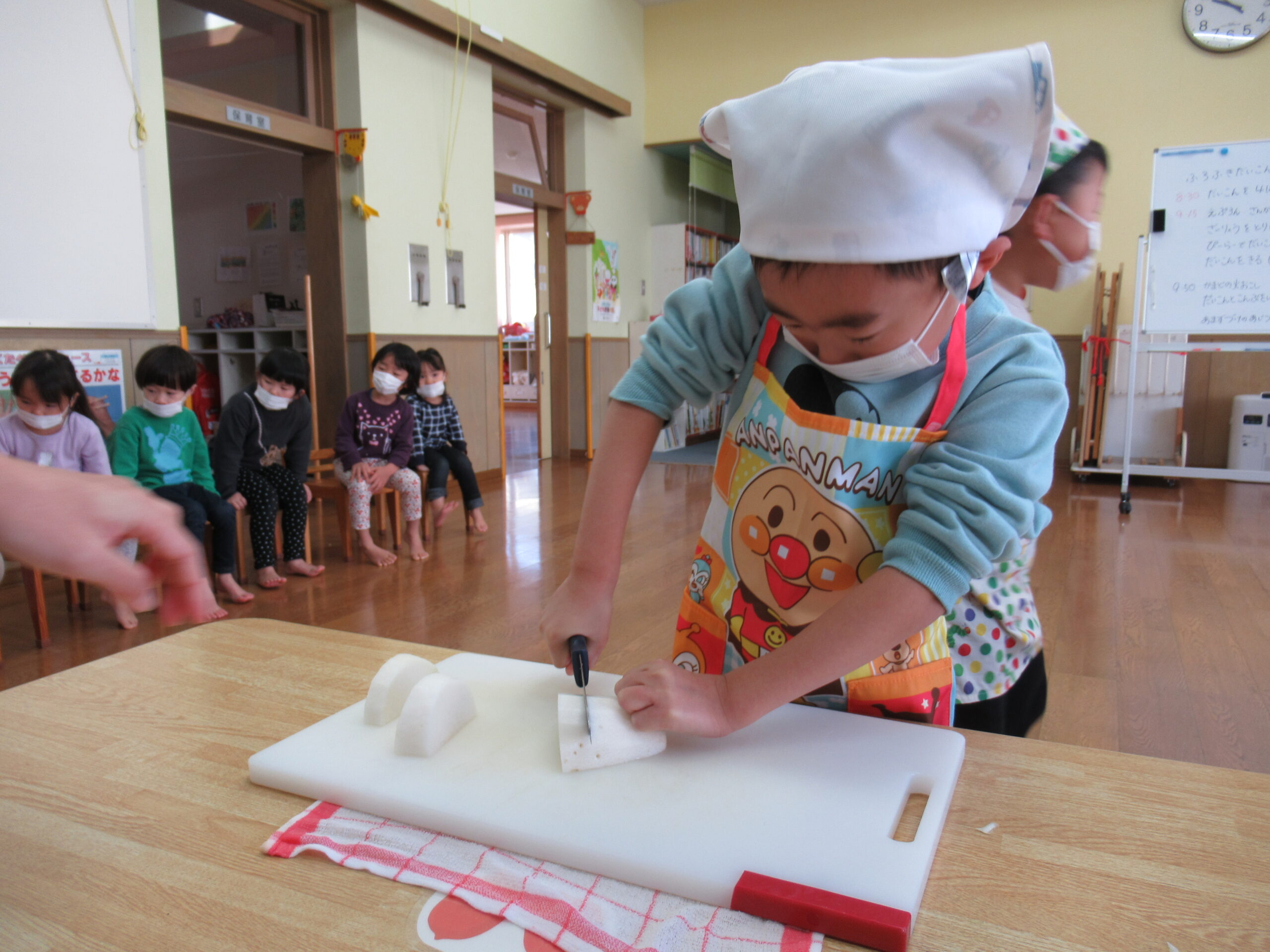 大根の皮むきをして、半月切に。保育園みんなにふるまいたい!と太くて立派な大根を切るのにも力が入ります。