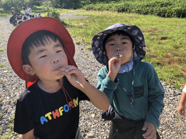 朝からとってもいい天気です。子どもたちは朝の冷たい水で顔を洗い、森の中の探検です。