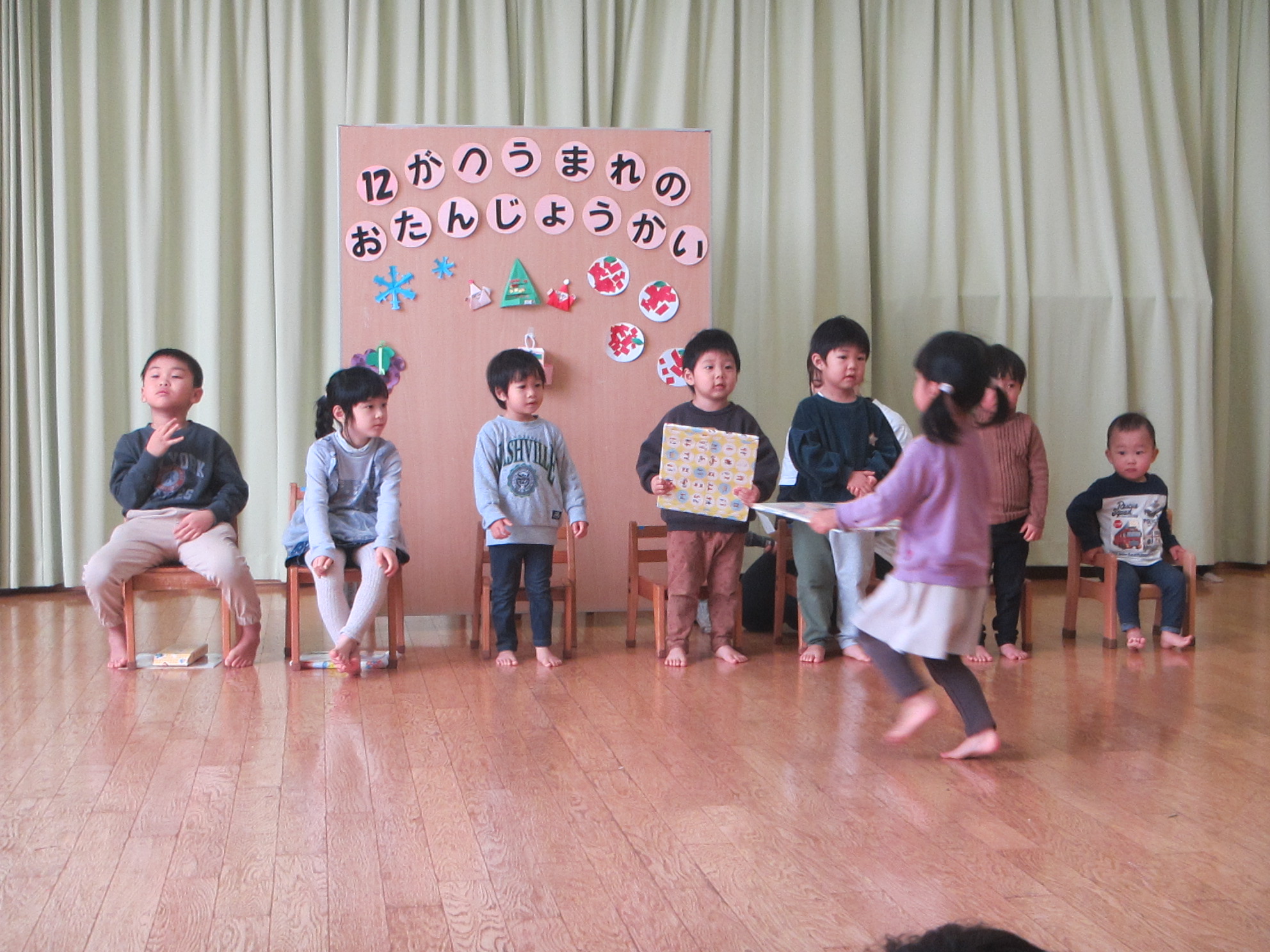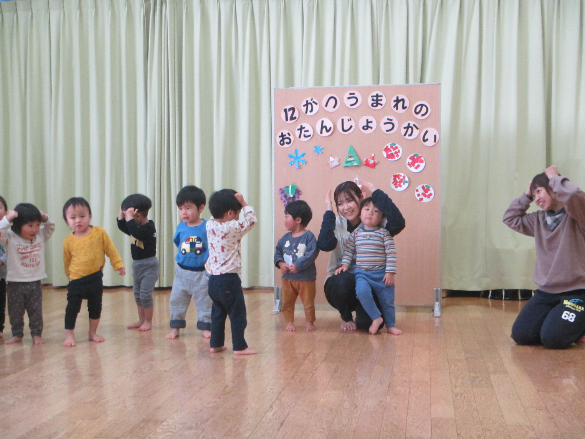 職員による迫力いっぱいの虎舞からはじまったお誕生会! みんなで12月生まれのお友だちをお祝いしました。