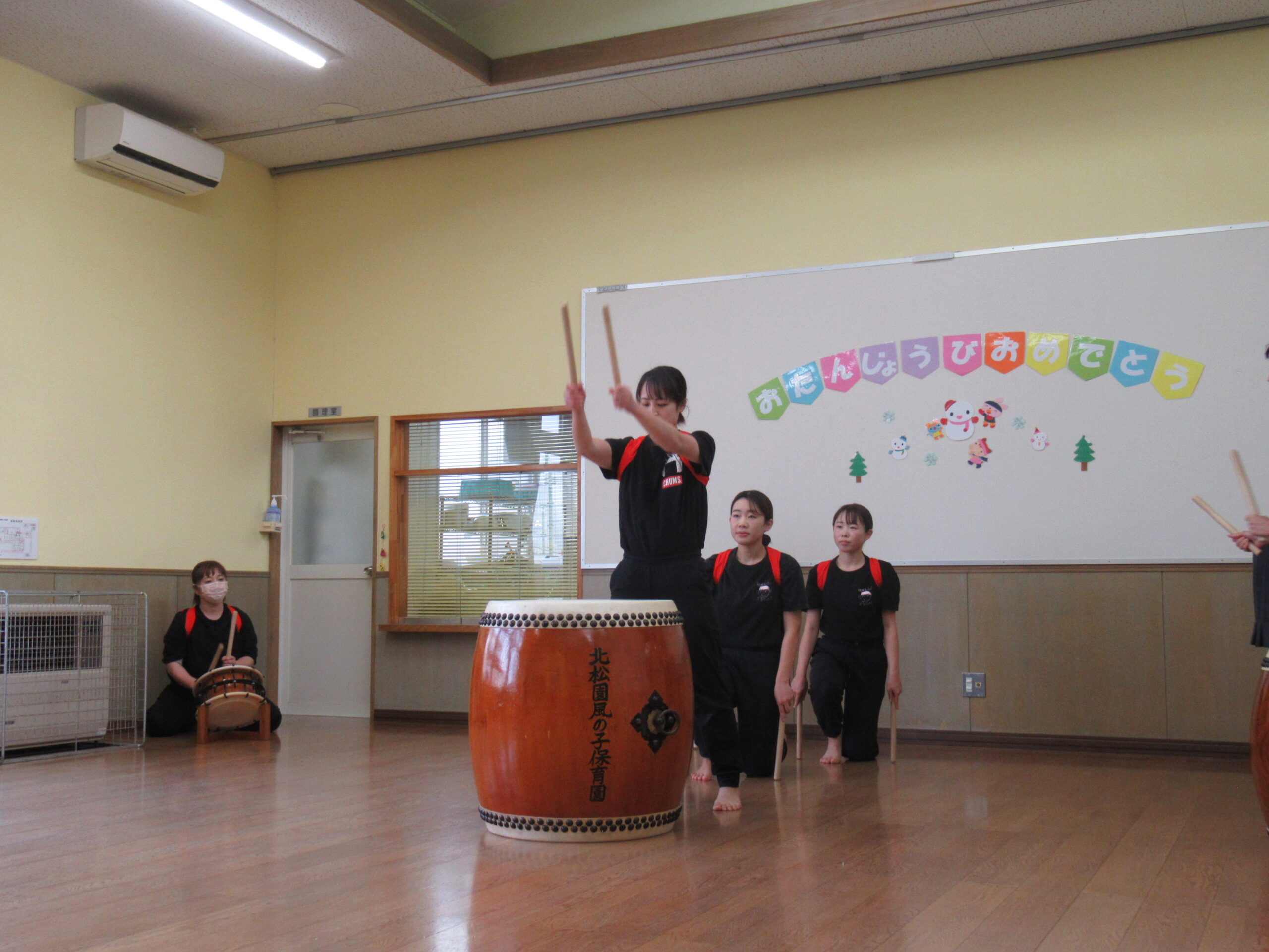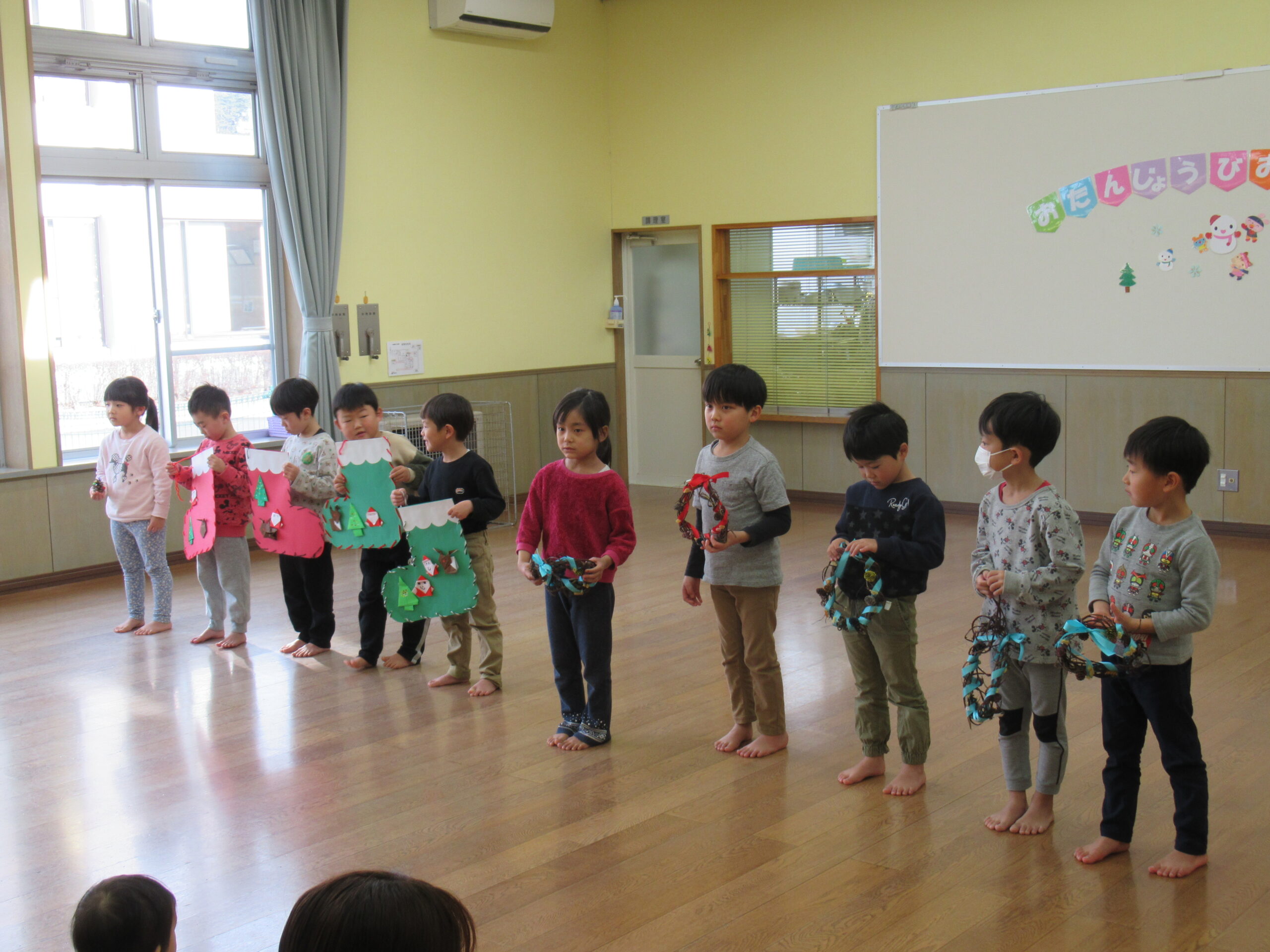 つばさ組は毎日やっているリズム運動の中から、得意のスキップ、カニ、ぐるぐるまわれを発表しました。たいよう組は、クリスマスの素敵な作品をたくさん見せてくれ、最後は「しずかなクリスマス」の歌をしっとり歌ってくれました。お楽しみの職員の出し物は、豊年太鼓。子どもたちも一緒に「イネノビソダテイキロ!」と掛け声をかけ、太鼓の音色と掛け声が響き渡っていました。