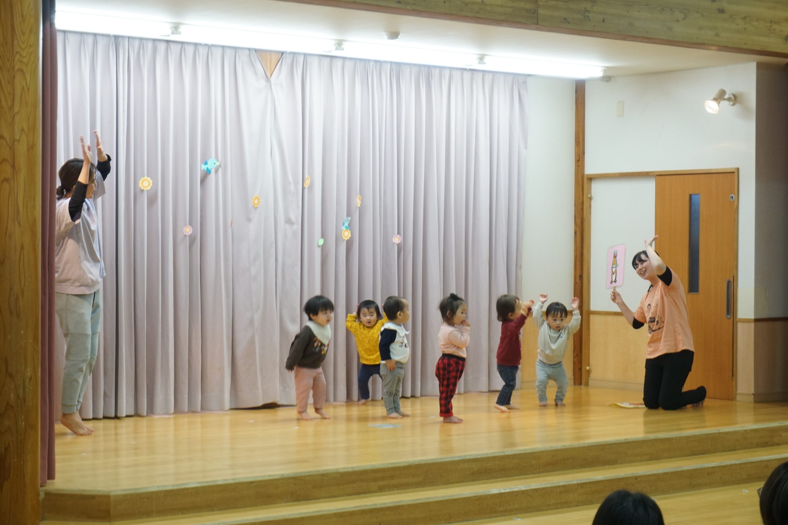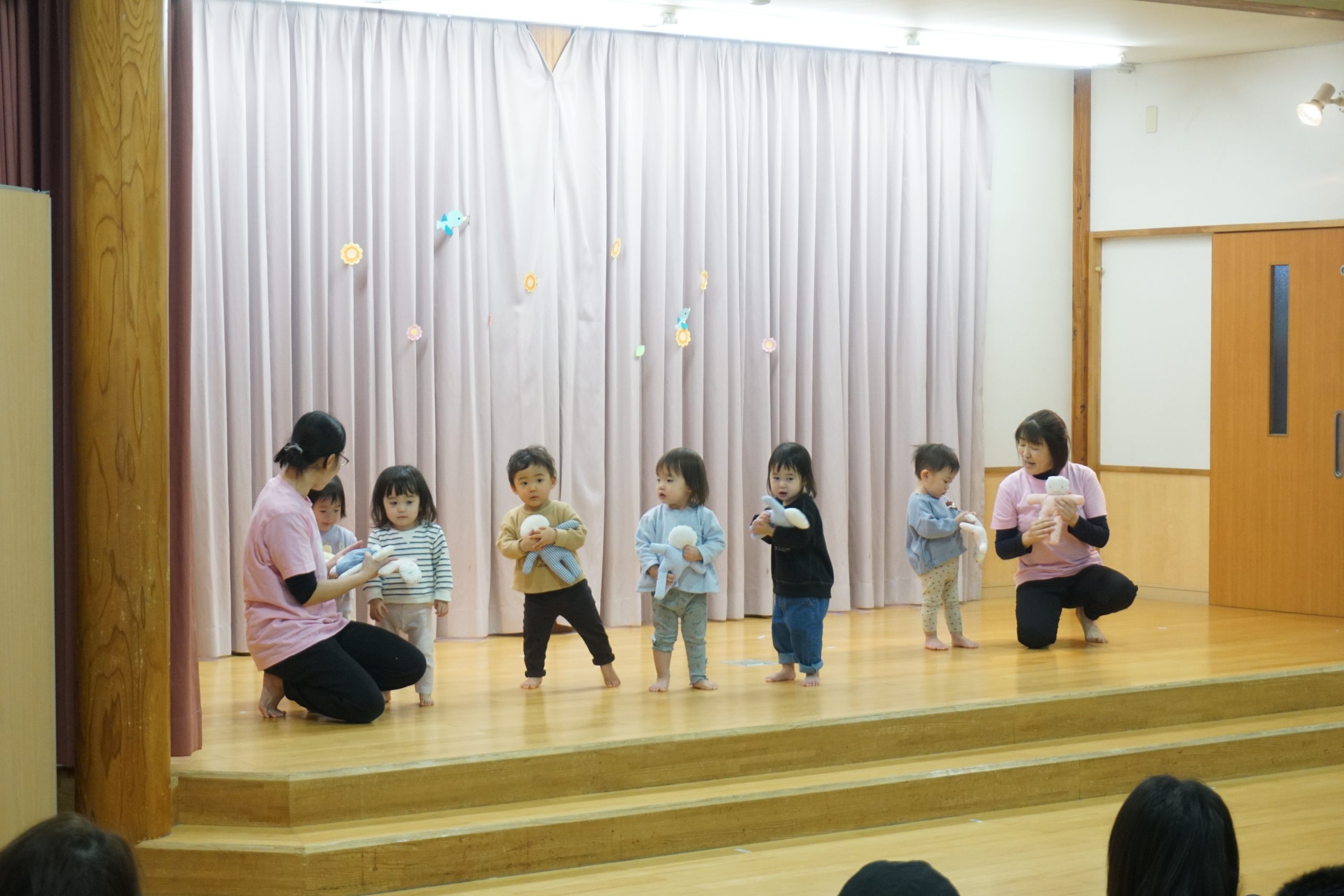 生活発表会は、今年1年の子どもたちの成長を保護者の方々と喜び合う日です。乳児の小さいクラスは、普段楽しんでいるわらべうたあそびやリズム運動、まねっこあそびの様子を見て頂きました。保育者やお友だちと楽しく、やりとりする姿がかわいらしい子どもたちでした。